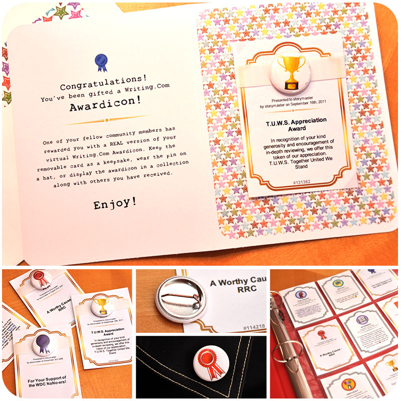AwardIcons are ribbons or trophies that may be awarded to items or portfolios within Writing.Com. Each AwardIcon is custom-designed by Writing.Com with varying levels of uniqueness and price. Award a virtual AwardIcon that is kept and displayed in the member's portfolio; mail a physical one to the member to keep and display at home!