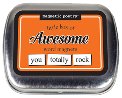 A cute little tin filled with totally awesome words. As a gift, a nice little token that won't soon be forgotten. Contains 72 themed magnetic word tiles, packaged in a shrink-wrapped tin container. Individual tiles are .375" tall. Product size is 1.75h x 2.25w x 5"d. Made in USA. |